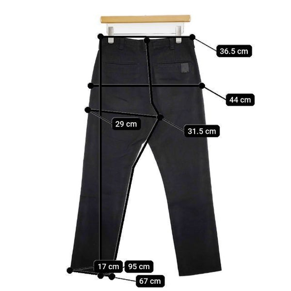 総丈:約95cm ウエスト:約36.5cm 股上:約31.5cm 股下:約67cm ヒップ:約44cm ワタリ幅:約29cm 裾幅:約17cm ※採寸画像がある商品はハンガーに吊るした状態での計測のため、平置きでの採寸とは差が生じる場合がございます。平置きでの実寸サイズをご希望の場合は、ご購入前に必ずご質問ください。