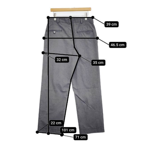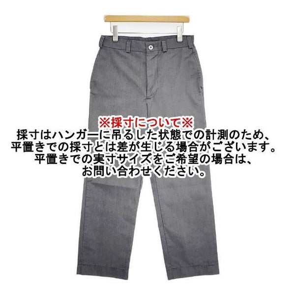 総丈:約101cm ウエスト:約39cm 股上:約35cm 股下:約71cm ヒップ:約46.5cm ワタリ幅:約32cm 裾幅:約22cm ※採寸画像がある商品はハンガーに吊るした状態での計測のため、平置きでの採寸とは差が生じる場合がございます。平置きでの実寸サイズをご希望の場合は、ご購入前に必ずご質問ください。