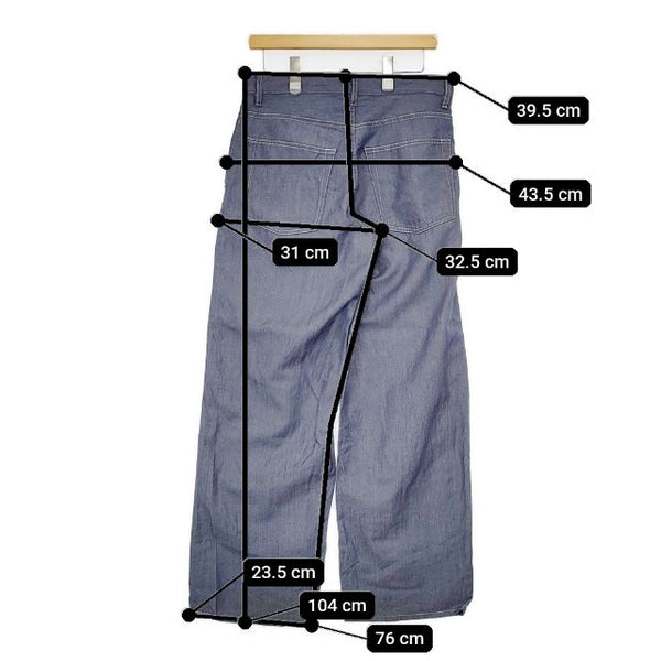 総丈:約104cm ウエスト:約39.5cm 股上:約32.5cm 股下:約76cm ヒップ:約43.5cm ワタリ幅:約31cm 裾幅:約23.5cm ※採寸画像がある商品はハンガーに吊るした状態での計測のため、平置きでの採寸とは差が生じる場合がございます。平置きでの実寸サイズをご希望の場合は、ご購入前に必ずご質問ください。
