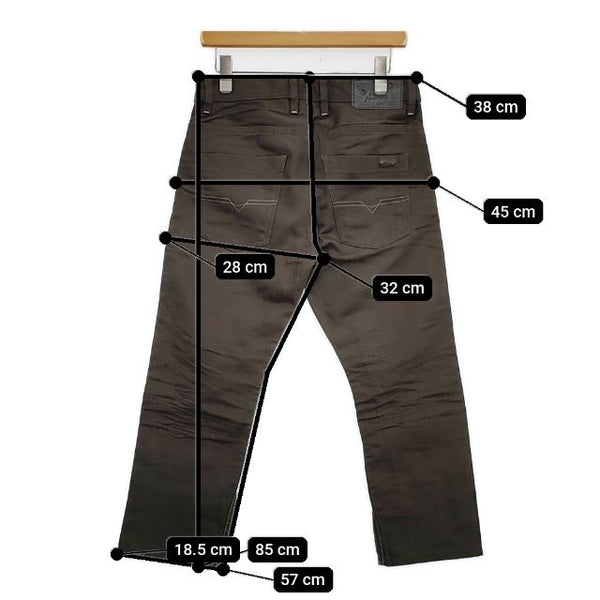 総丈:約85cm ウエスト:約38cm 股上:約32cm 股下:約57cm ヒップ:約45cm ワタリ幅:約28cm 裾幅:約18.5cm ※採寸画像がある商品はハンガーに吊るした状態での計測のため、平置きでの採寸とは差が生じる場合がございます。平置きでの実寸サイズをご希望の場合は、ご購入前に必ずご質問ください。