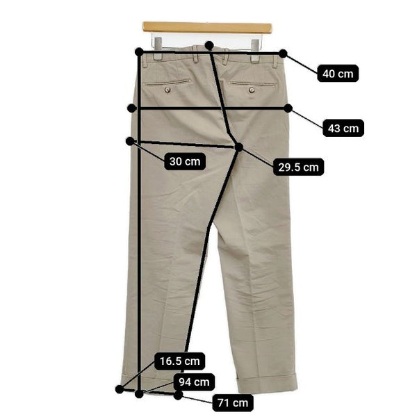 総丈:約94cm ウエスト:約40cm 股上:約29.5cm 股下:約71cm ヒップ:約43cm ワタリ幅:約30cm 裾幅:約16.5cm ※採寸画像がある商品はハンガーに吊るした状態での計測のため、平置きでの採寸とは差が生じる場合がございます。平置きでの実寸サイズをご希望の場合は、ご購入前に必ずご質問ください。
