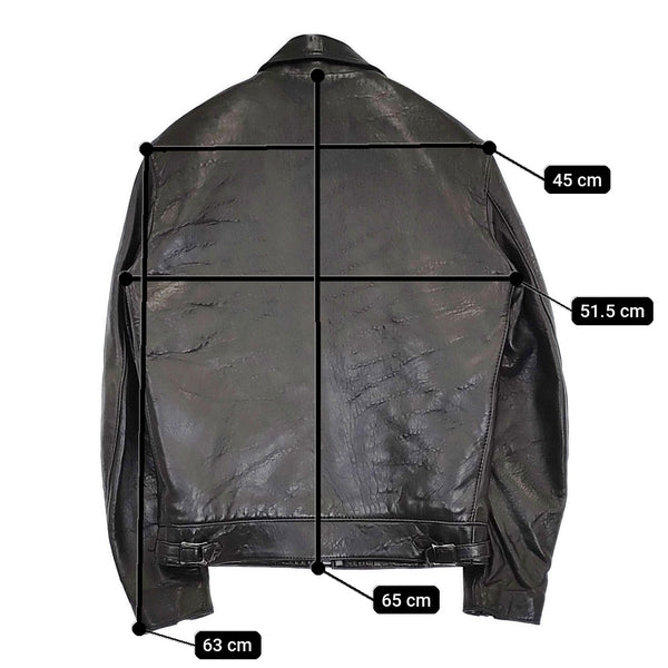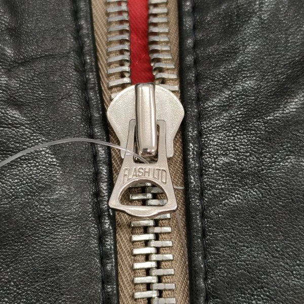 カスタム品の為正確にはわかりかねますが、恐らくレギュラーフィットでレザーはシープ。裾の部分を多少絞っているお品物のように思われます。 |