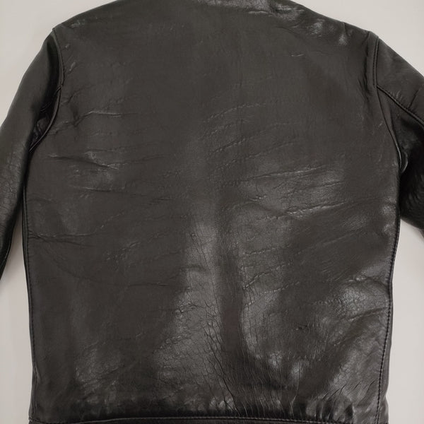 全体に着用感、袖に白い汚れ、ところどころにレザー素材特有の小傷あり。