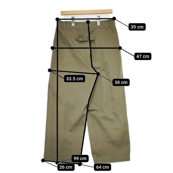 総丈:約99cm ウエスト:約39cm 股上:約38cm 股下:約64cm ヒップ:約47cm ワタリ幅:約33.5cm 裾幅:約26cm ※採寸画像がある商品はハンガーに吊るした状態での計測のため、平置きでの採寸とは差が生じる場合がございます。平置きでの実寸サイズをご希望の場合は、ご購入前に必ずご質問ください。