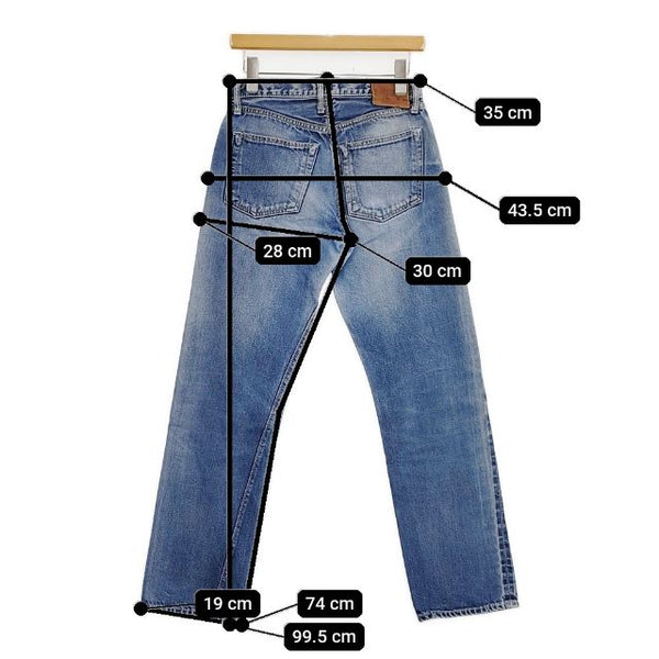 総丈:約99.5cm ウエスト:約35cm 股上:約30cm 股下:約74cm ヒップ:約43.5cm ワタリ幅:約28cm 裾幅:約19cm ※採寸画像がある商品はハンガーに吊るした状態での計測のため、平置きでの採寸とは差が生じる場合がございます。平置きでの実寸サイズをご希望の場合は、ご購入前に必ずご質問ください。
