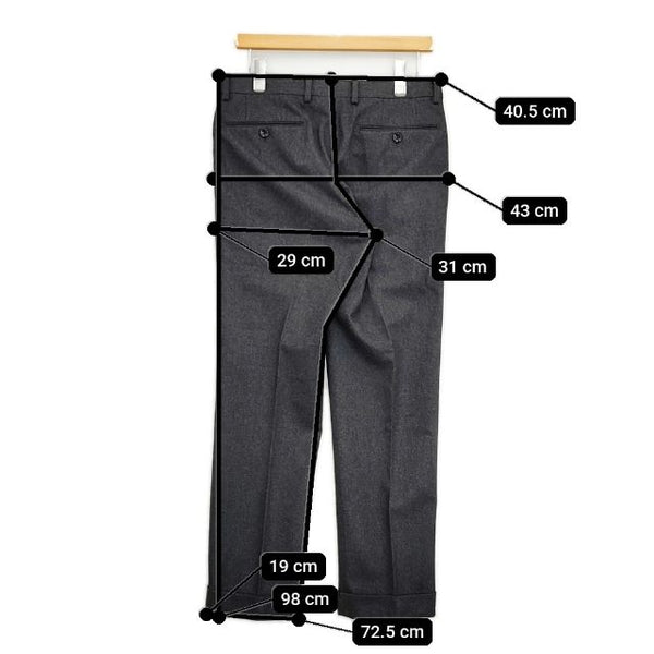 総丈:約98cm ウエスト:約40.5cm 股上:約31cm 股下:約72.5cm ヒップ:約43cm ワタリ幅:約29cm 裾幅:約19cm ※採寸画像がある商品はハンガーに吊るした状態での計測のため、平置きでの採寸とは差が生じる場合がございます。平置きでの実寸サイズをご希望の場合は、ご購入前に必ずご質問ください。