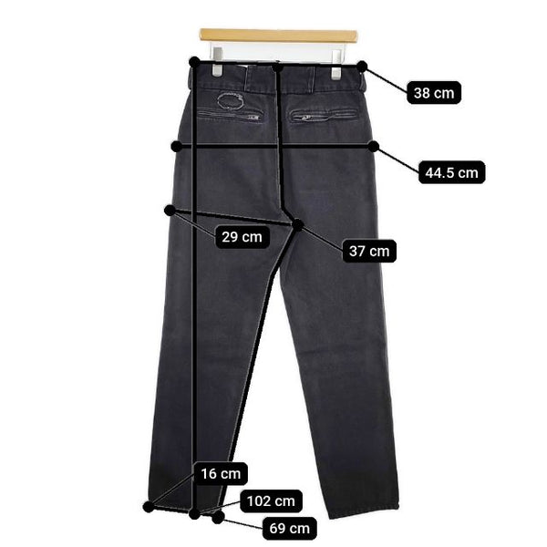 総丈:約102cm ウエスト:約38cm 股上:約37cm 股下:約69cm ヒップ:約44.5cm ワタリ幅:約29cm 裾幅:約16cm ※採寸画像がある商品はハンガーに吊るした状態での計測のため、平置きでの採寸とは差が生じる場合がございます。平置きでの実寸サイズをご希望の場合は、ご購入前に必ずご質問ください。