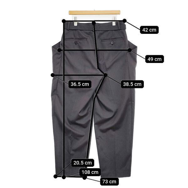 総丈:約108cm ウエスト:約42cm 股上:約38.5cm 股下:約73cm ヒップ:約49cm ワタリ幅:約36.5cm 裾幅:約20.5cm ※採寸画像がある商品はハンガーに吊るした状態での計測のため、平置きでの採寸とは差が生じる場合がございます。平置きでの実寸サイズをご希望の場合は、ご購入前に必ずご質問ください。