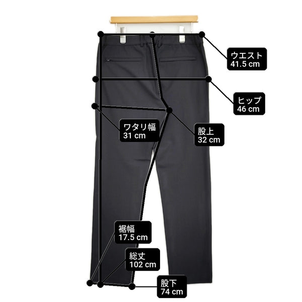 総丈:約102cm ウエスト:約41.5cm ウエスト最長:約50cm 股上:約32cm 股下:約74cm ヒップ:約46cm ワタリ幅:約31cm 裾幅:約17.5cm ※採寸画像がある商品はハンガーに吊るした状態での計測のため、平置きでの採寸とは差が生じる場合がございます。平置きでの実寸サイズをご希望の場合は、ご購入前に必ずご質問ください。