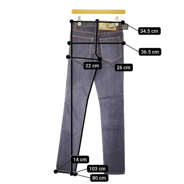 総丈:約103cm ウエスト:約34.5cm 股上:約26cm 股下:約80cm ヒップ:約36.5cm ワタリ幅:約22cm 裾幅:約14cm ※採寸画像がある商品はハンガーに吊るした状態での計測のため、平置きでの採寸とは差が生じる場合がございます。平置きでの実寸サイズをご希望の場合は、ご購入前に必ずご質問ください。