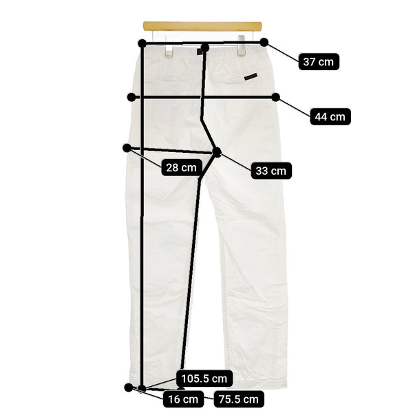 総丈:約105.5cm ウエスト:約37cm ウエスト最長:約45cm 股上:約33cm 股下:約75.5cm ヒップ:約44cm ワタリ幅:約28cm 裾幅:約16cm ※採寸画像がある商品はハンガーに吊るした状態での計測のため、平置きでの採寸とは差が生じる場合がございます。平置きでの実寸サイズをご希望の場合は、ご購入前に必ずご質問ください。