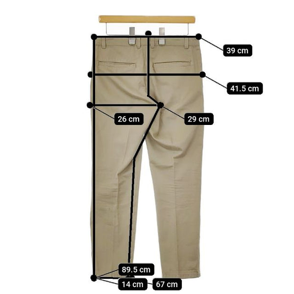 総丈:約89.5cm ウエスト:約39cm 股上:約29cm 股下:約67cm ヒップ:約41.5cm ワタリ幅:約26cm 裾幅:約14cm ※採寸画像がある商品はハンガーに吊るした状態での計測のため、平置きでの採寸とは差が生じる場合がございます。平置きでの実寸サイズをご希望の場合は、ご購入前に必ずご質問ください。