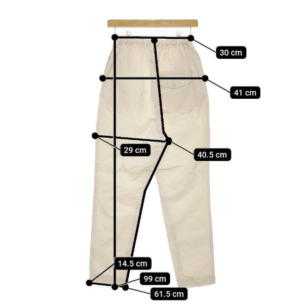 総丈:約99cm ウエスト:約30cm ウエスト最長:約47cm 股上:約40.5cm 股下:約61.5cm ヒップ:約41cm ワタリ幅:約29cm 裾幅:約14.5cm ※採寸画像がある商品はハンガーに吊るした状態での計測のため、平置きでの採寸とは差が生じる場合がございます。平置きでの実寸サイズをご希望の場合は、ご購入前に必ずご質問ください。