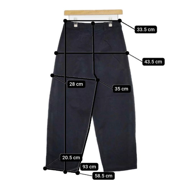 総丈:約93cm ウエスト:約33.5cm 股上:約35cm 股下:約58.5cm ヒップ:約43.5cm ワタリ幅:約28cm 裾幅:約20.5cm ※採寸画像がある商品はハンガーに吊るした状態での計測のため、平置きでの採寸とは差が生じる場合がございます。平置きでの実寸サイズをご希望の場合は、ご購入前に必ずご質問ください。