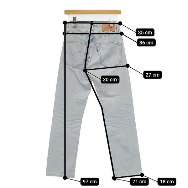 総丈:約97cm ウエスト:約35cm 股上:約30cm 股下:約71cm ヒップ:約36cm ワタリ幅:約27cm 裾幅:約18cm ※採寸画像がある商品はハンガーに吊るした状態での計測のため、平置きでの採寸とは差が生じる場合がございます。平置きでの実寸サイズをご希望の場合は、ご購入前に必ずご質問ください。