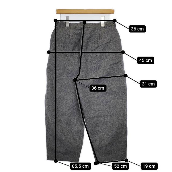 総丈:約85.5cm ウエスト:約36cm 股上:約36cm 股下:約52cm ヒップ:約45cm ワタリ幅:約31cm 裾幅:約19cm ※採寸画像がある商品はハンガーに吊るした状態での計測のため、平置きでの採寸とは差が生じる場合がございます。平置きでの実寸サイズをご希望の場合は、ご購入前に必ずご質問ください。