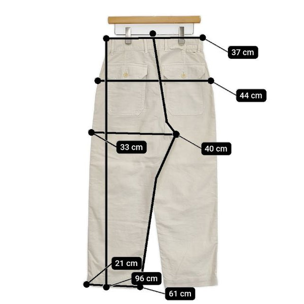 総丈:約96cm ウエスト:約37cm 股上:約40cm 股下:約61cm ヒップ:約44cm ワタリ幅:約33cm 裾幅:約21cm ※採寸画像がある商品はハンガーに吊るした状態での計測のため、平置きでの採寸とは差が生じる場合がございます。平置きでの実寸サイズをご希望の場合は、ご購入前に必ずご質問ください。