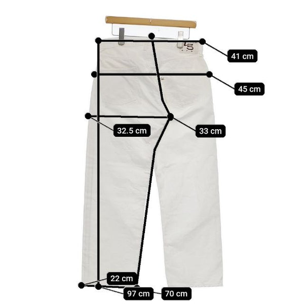総丈:約97cm ウエスト:約41cm 股上:約33cm 股下:約70cm ヒップ:約45cm ワタリ幅:約32.5cm 裾幅:約22cm ※採寸画像がある商品はハンガーに吊るした状態での計測のため、平置きでの採寸とは差が生じる場合がございます。平置きでの実寸サイズをご希望の場合は、ご購入前に必ずご質問ください。