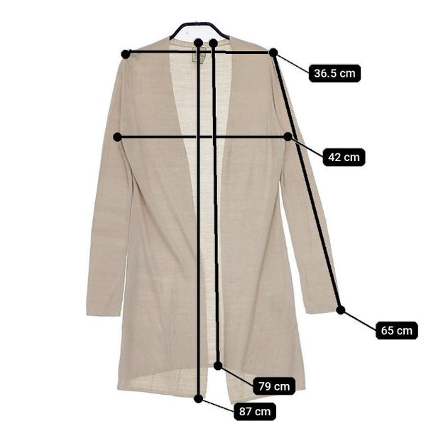 肩幅:約36.5cm 着丈:約87cm 着丈(後ろ):約79cm 身幅:約42cm 袖丈:約65cm ※採寸画像がある商品はハンガーに吊るした状態での計測のため、平置きでの採寸とは差が生じる場合がございます。平置きでの実寸サイズをご希望の場合は、ご購入前に必ずご質問ください。