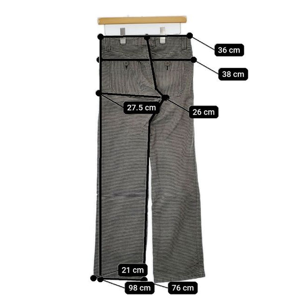 総丈:約98cm ウエスト:約36cm 股上:約26cm 股下:約76cm ヒップ:約38cm ワタリ幅:約27.5cm 裾幅:約21cm ※採寸画像がある商品はハンガーに吊るした状態での計測のため、平置きでの採寸とは差が生じる場合がございます。平置きでの実寸サイズをご希望の場合は、ご購入前に必ずご質問ください。