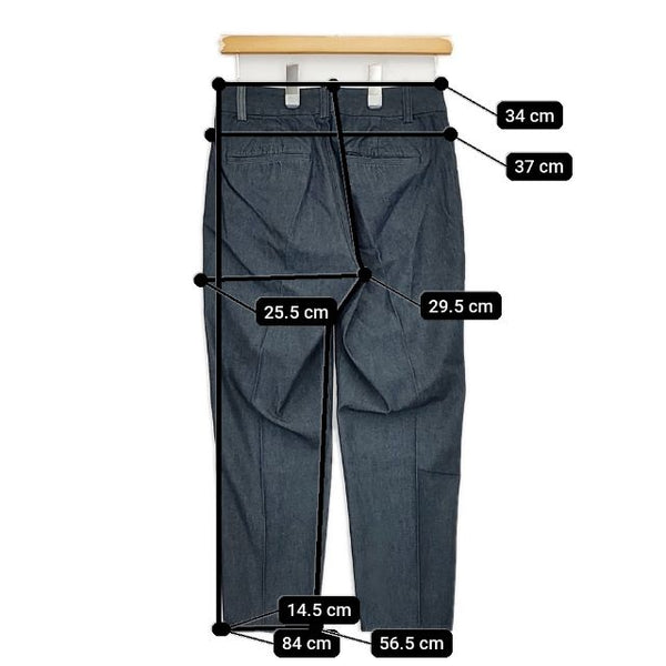 総丈:約84cm ウエスト:約34cm 股上:約29.5cm 股下:約56.5cm ヒップ:約37cm ワタリ幅:約25.5cm 裾幅:約14.5cm ※採寸画像がある商品はハンガーに吊るした状態での計測のため、平置きでの採寸とは差が生じる場合がございます。平置きでの実寸サイズをご希望の場合は、ご購入前に必ずご質問ください。