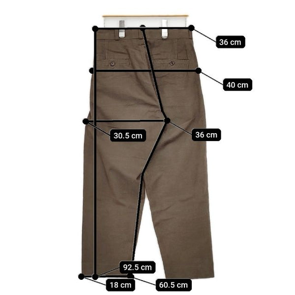 総丈:約92.5cm ウエスト:約36cm 股上:約36cm 股下:約60.5cm ヒップ:約40cm ワタリ幅:約30.5cm 裾幅:約18cm ※採寸画像がある商品はハンガーに吊るした状態での計測のため、平置きでの採寸とは差が生じる場合がございます。平置きでの実寸サイズをご希望の場合は、ご購入前に必ずご質問ください。
