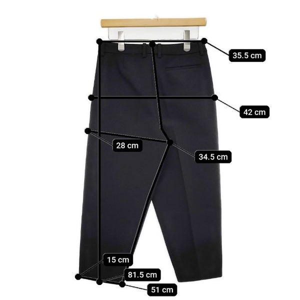 総丈:約81.5cm ウエスト:約35.5cm 股上:約34.5cm 股下:約51cm ヒップ:約42cm ワタリ幅:約28cm 裾幅:約15cm ※採寸画像がある商品はハンガーに吊るした状態での計測のため、平置きでの採寸とは差が生じる場合がございます。平置きでの実寸サイズをご希望の場合は、ご購入前に必ずご質問ください。