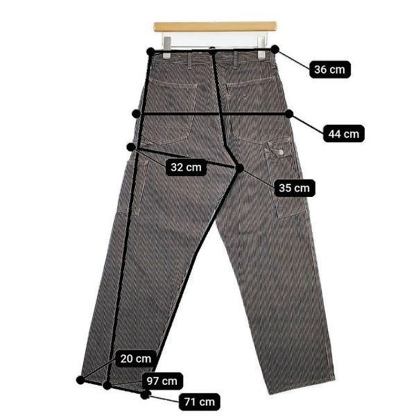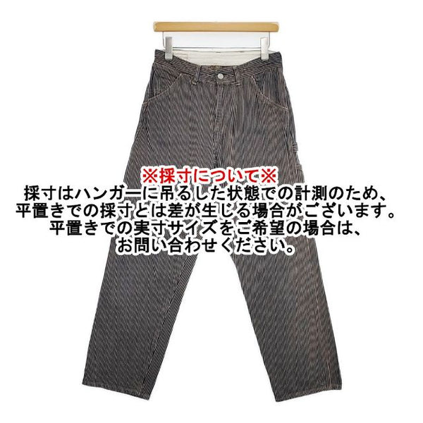 総丈:約97cm ウエスト:約36cm 股上:約35cm 股下:約71cm ヒップ:約44cm ワタリ幅:約32cm 裾幅:約20cm ※採寸画像がある商品はハンガーに吊るした状態での計測のため、平置きでの採寸とは差が生じる場合がございます。平置きでの実寸サイズをご希望の場合は、ご購入前に必ずご質問ください。