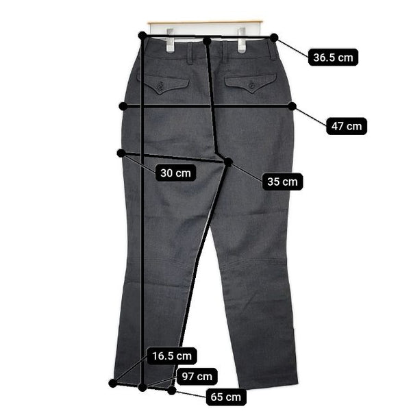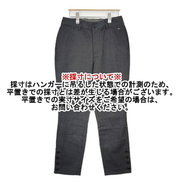 総丈:約97cm ウエスト:約36.5cm 股上:約35cm 股下:約65cm ヒップ:約47cm ワタリ幅:約30cm 裾幅:約16.5cm ※採寸画像がある商品はハンガーに吊るした状態での計測のため、平置きでの採寸とは差が生じる場合がございます。平置きでの実寸サイズをご希望の場合は、ご購入前に必ずご質問ください。