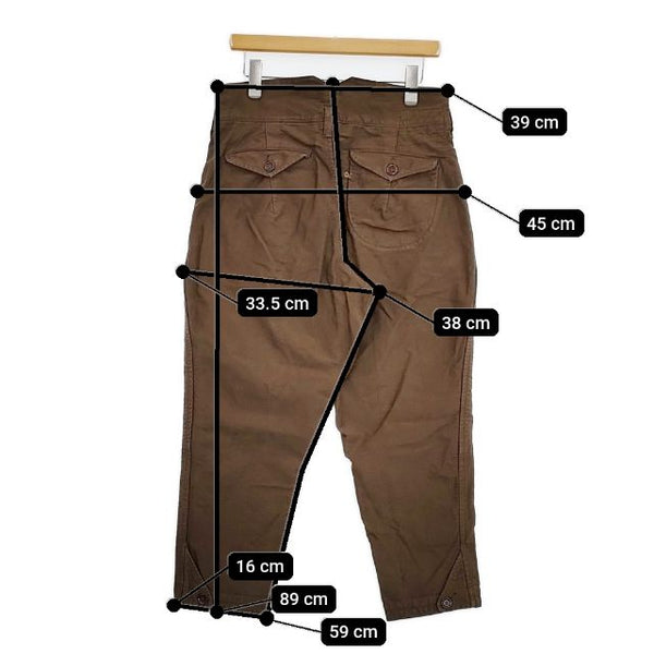 総丈:約89cm ウエスト:約39cm 股上:約38cm 股下:約59cm ヒップ:約45cm ワタリ幅:約33.5cm 裾幅:約16cm ※採寸画像がある商品はハンガーに吊るした状態での計測のため、平置きでの採寸とは差が生じる場合がございます。平置きでの実寸サイズをご希望の場合は、ご購入前に必ずご質問ください。