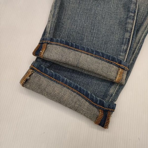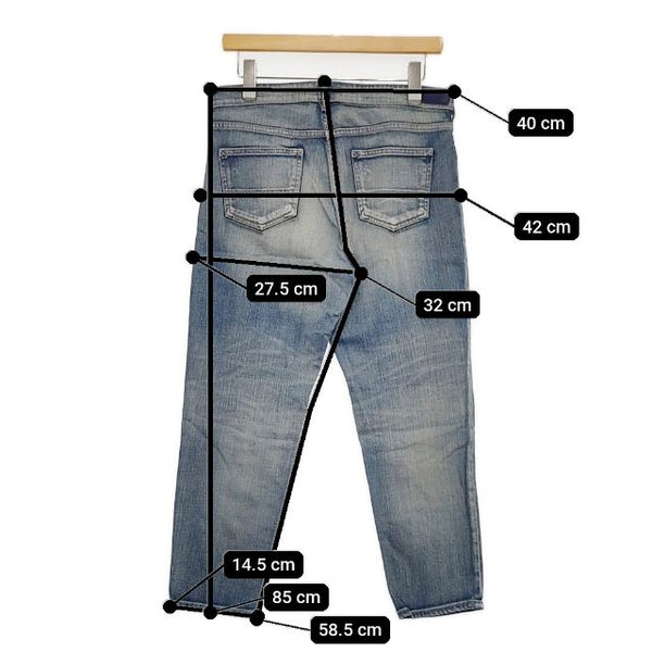 総丈:約85cm ウエスト:約40cm 股上:約32cm 股下:約58.5cm ヒップ:約42cm ワタリ幅:約27.5cm 裾幅:約14.5cm ※採寸画像がある商品はハンガーに吊るした状態での計測のため、平置きでの採寸とは差が生じる場合がございます。平置きでの実寸サイズをご希望の場合は、ご購入前に必ずご質問ください。