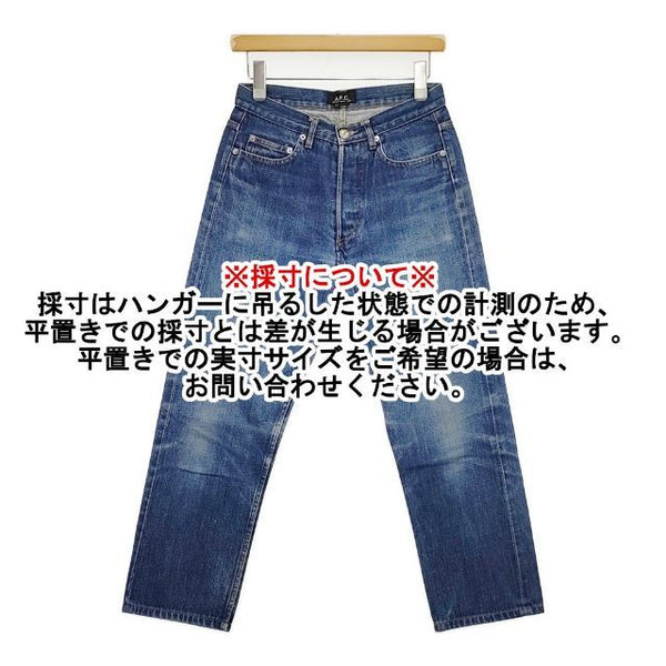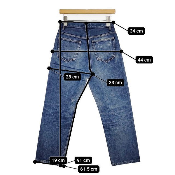 総丈:約91cm ウエスト:約34cm 股上:約33cm 股下:約61.5cm ヒップ:約44cm ワタリ幅:約28cm 裾幅:約19cm ※採寸画像がある商品はハンガーに吊るした状態での計測のため、平置きでの採寸とは差が生じる場合がございます。平置きでの実寸サイズをご希望の場合は、ご購入前に必ずご質問ください。