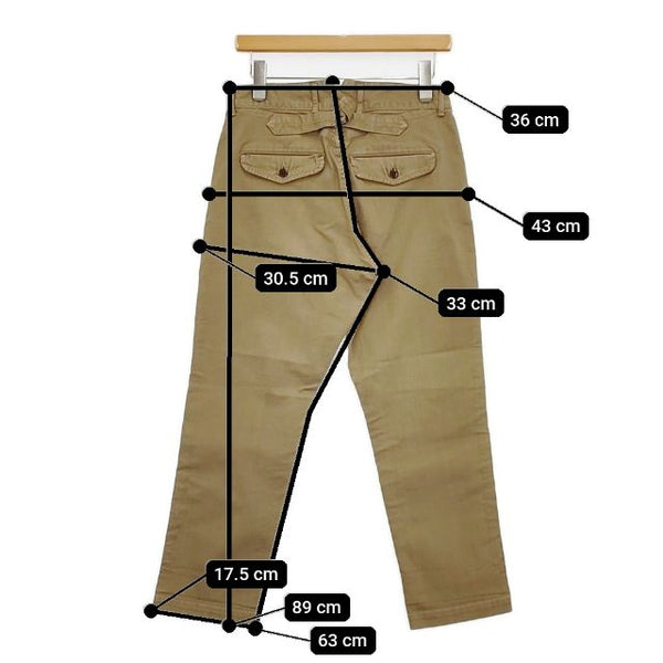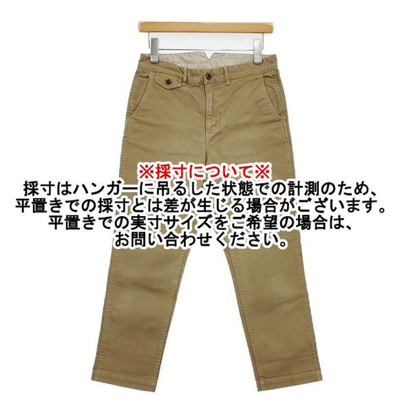 総丈:約89cm ウエスト:約36cm 股上:約33cm 股下:約63cm ヒップ:約43cm ワタリ幅:約30.5cm 裾幅:約17.5cm ※採寸画像がある商品はハンガーに吊るした状態での計測のため、平置きでの採寸とは差が生じる場合がございます。平置きでの実寸サイズをご希望の場合は、ご購入前に必ずご質問ください。
