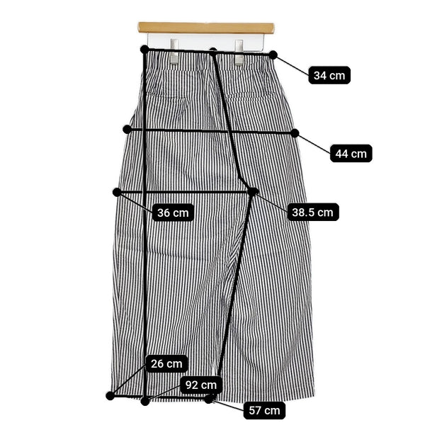総丈:約92cm ウエスト:約34cm ウエスト最長:約43cm 股上:約38.5cm 股下:約57cm ヒップ:約44cm ワタリ幅:約36cm 裾幅:約26cm ※採寸画像がある商品はハンガーに吊るした状態での計測のため、平置きでの採寸とは差が生じる場合がございます。平置きでの実寸サイズをご希望の場合は、ご購入前に必ずご質問ください。