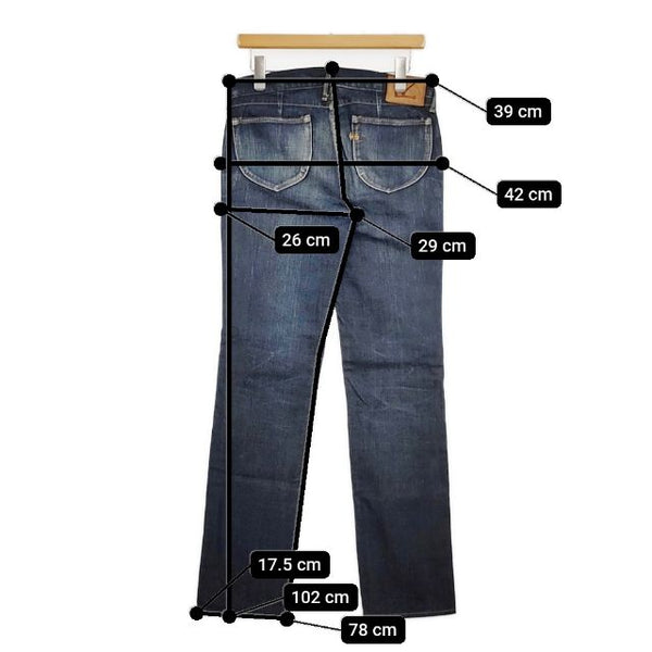総丈:約102cm ウエスト:約39cm 股上:約29cm 股下:約78cm ヒップ:約42cm ワタリ幅:約26cm 裾幅:約17.5cm ※採寸画像がある商品はハンガーに吊るした状態での計測のため、平置きでの採寸とは差が生じる場合がございます。平置きでの実寸サイズをご希望の場合は、ご購入前に必ずご質問ください。