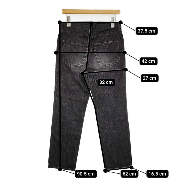 総丈:約90.5cm ウエスト:約37.5cm 股上:約32cm 股下:約62cm ヒップ:約42cm ワタリ幅:約27cm 裾幅:約16.5cm ※採寸画像がある商品はハンガーに吊るした状態での計測のため、平置きでの採寸とは差が生じる場合がございます。平置きでの実寸サイズをご希望の場合は、ご購入前に必ずご質問ください。