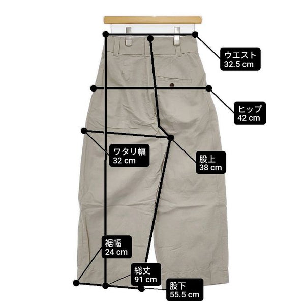 総丈:約91cm ウエスト:約32.5cm 股上:約38cm 股下:約55.5cm ヒップ:約42cm ワタリ幅:約32cm 裾幅:約24cm ※採寸画像がある商品はハンガーに吊るした状態での計測のため、平置きでの採寸とは差が生じる場合がございます。平置きでの実寸サイズをご希望の場合は、ご購入前に必ずご質問ください。
