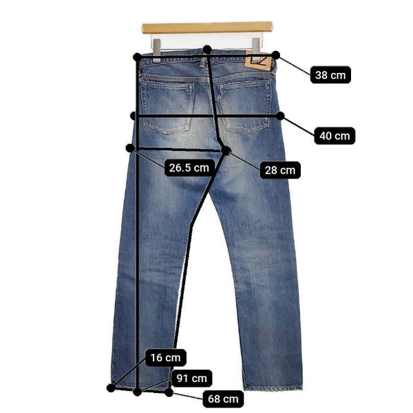 総丈:約91cm ウエスト:約38cm 股上:約28cm 股下:約68cm ヒップ:約40cm ワタリ幅:約26.5cm 裾幅:約16cm ※採寸画像がある商品はハンガーに吊るした状態での計測のため、平置きでの採寸とは差が生じる場合がございます。平置きでの実寸サイズをご希望の場合は、ご購入前に必ずご質問ください。
