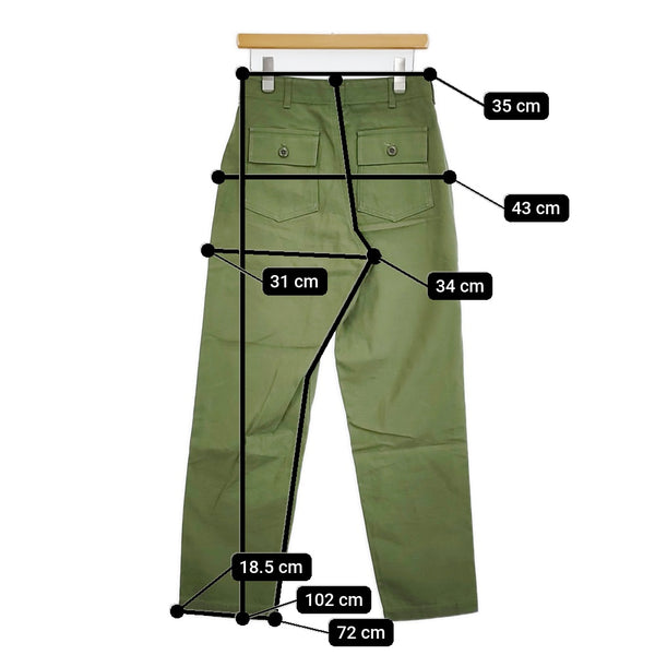 総丈:約102cm ウエスト:約35cm 股上:約34cm 股下:約72cm ヒップ:約43cm ワタリ幅:約31cm 裾幅:約18.5cm ※採寸画像がある商品はハンガーに吊るした状態での計測のため、平置きでの採寸とは差が生じる場合がございます。平置きでの実寸サイズをご希望の場合は、ご購入前に必ずご質問ください。