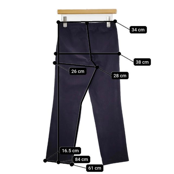 総丈:約84cm ウエスト:約34cm ウエスト最長:約46cm 股上:約28cm 股下:約61cm ヒップ:約38cm ワタリ幅:約26cm 裾幅:約16.5cm ※採寸画像がある商品はハンガーに吊るした状態での計測のため、平置きでの採寸とは差が生じる場合がございます。平置きでの実寸サイズをご希望の場合は、ご購入前に必ずご質問ください。