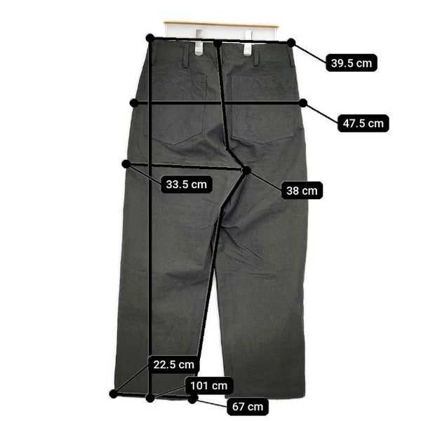 総丈:約101cm ウエスト:約39.5cm 股上:約38cm 股下:約67cm ヒップ:約47.5cm ワタリ幅:約33.5cm 裾幅:約22.5cm ※採寸画像がある商品はハンガーに吊るした状態での計測のため、平置きでの採寸とは差が生じる場合がございます。平置きでの実寸サイズをご希望の場合は、ご購入前に必ずご質問ください。