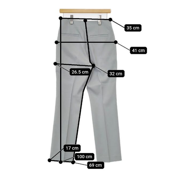 総丈:約100cm ウエスト:約35cm 股上:約32cm 股下:約69cm ヒップ:約41cm ワタリ幅:約26.5cm 裾幅:約17cm ※採寸画像がある商品はハンガーに吊るした状態での計測のため、平置きでの採寸とは差が生じる場合がございます。平置きでの実寸サイズをご希望の場合は、ご購入前に必ずご質問ください。
