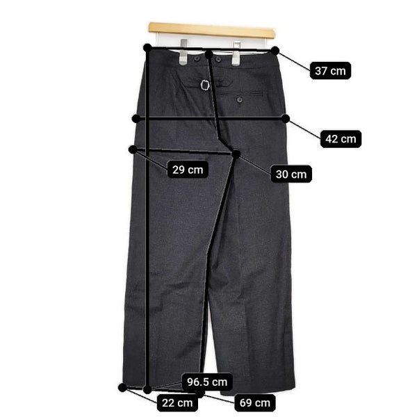 総丈:約96.5cm ウエスト:約37cm 股上:約30cm 股下:約69cm ヒップ:約42cm ワタリ幅:約29cm 裾幅:約22cm ※採寸画像がある商品はハンガーに吊るした状態での計測のため、平置きでの採寸とは差が生じる場合がございます。平置きでの実寸サイズをご希望の場合は、ご購入前に必ずご質問ください。