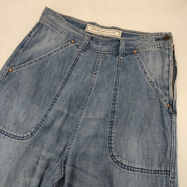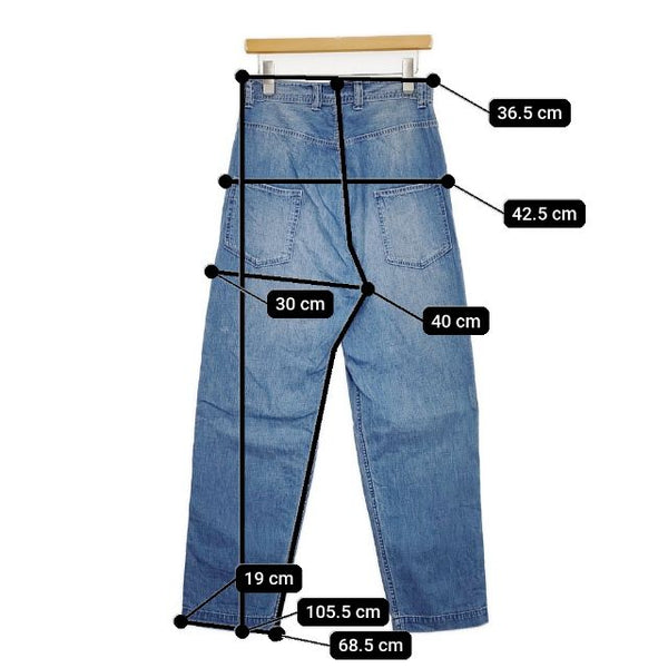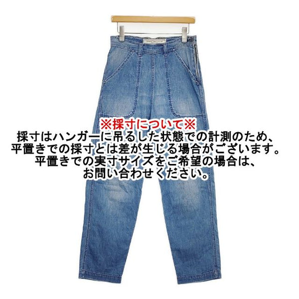 総丈:約105.5cm ウエスト:約36.5cm 股上:約40cm 股下:約68.5cm ヒップ:約42.5cm ワタリ幅:約30cm 裾幅:約19cm ※採寸画像がある商品はハンガーに吊るした状態での計測のため、平置きでの採寸とは差が生じる場合がございます。平置きでの実寸サイズをご希望の場合は、ご購入前に必ずご質問ください。