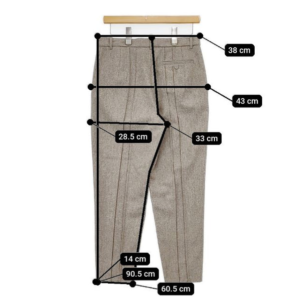 総丈:約90.5cm ウエスト:約38cm 股上:約33cm 股下:約60.5cm ヒップ:約43cm ワタリ幅:約28.5cm 裾幅:約14cm ※採寸画像がある商品はハンガーに吊るした状態での計測のため、平置きでの採寸とは差が生じる場合がございます。平置きでの実寸サイズをご希望の場合は、ご購入前に必ずご質問ください。