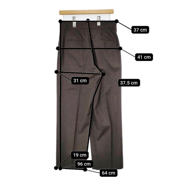 総丈:約96cm ウエスト:約37cm 股上:約37.5cm 股下:約64cm ヒップ:約41cm ワタリ幅:約31cm 裾幅:約19cm ※採寸画像がある商品はハンガーに吊るした状態での計測のため、平置きでの採寸とは差が生じる場合がございます。平置きでの実寸サイズをご希望の場合は、ご購入前に必ずご質問ください。