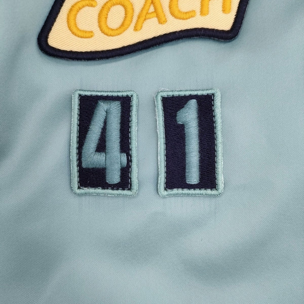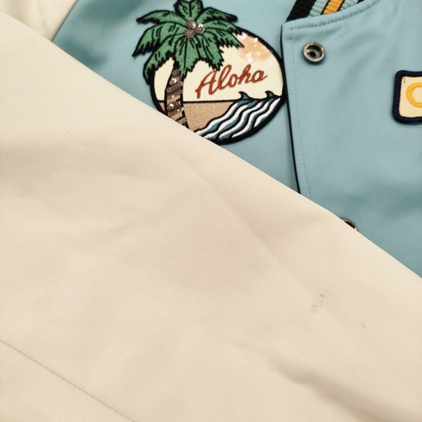 ネイビー側の両袖にシミ、汚れ、ライトブルー側の右袖に汚れ、「41」ワッペン付近にシミのような箇所、フロントに写真では確認できない程度の薄い白い箇所数ヶ所あり。