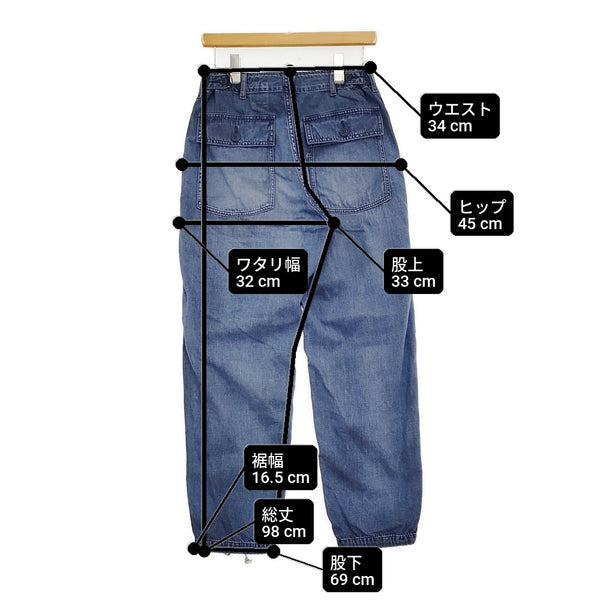 総丈:約98cm ウエスト:約34cm 股上:約33cm 股下:約69cm ヒップ:約45cm ワタリ幅:約32cm 裾幅:約16.5cm ※採寸画像がある商品はハンガーに吊るした状態での計測のため、平置きでの採寸とは差が生じる場合がございます。平置きでの実寸サイズをご希望の場合は、ご購入前に必ずご質問ください。