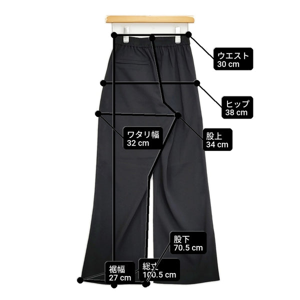 総丈:約100.5cm ウエスト:約30cm ウエスト最長:約45cm 股上:約34cm 股下:約70.5cm ヒップ:約38cm ワタリ幅:約32cm 裾幅:約27cm ※採寸画像がある商品はハンガーに吊るした状態での計測のため、平置きでの採寸とは差が生じる場合がございます。平置きでの実寸サイズをご希望の場合は、ご購入前に必ずご質問ください。