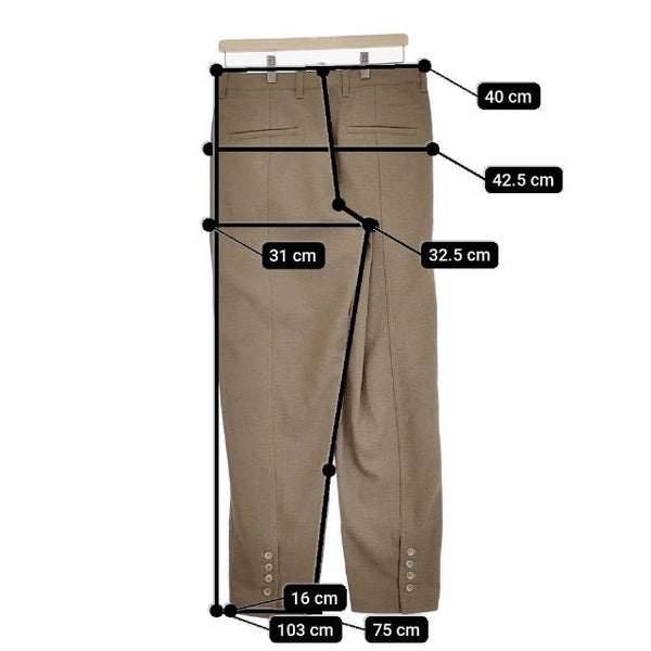 総丈:約103cm ウエスト:約40cm 股上:約32.5cm 股下:約75cm ヒップ:約42.5cm ワタリ幅:約31cm 裾幅:約16cm ※採寸画像がある商品はハンガーに吊るした状態での計測のため、平置きでの採寸とは差が生じる場合がございます。平置きでの実寸サイズをご希望の場合は、ご購入前に必ずご質問ください。